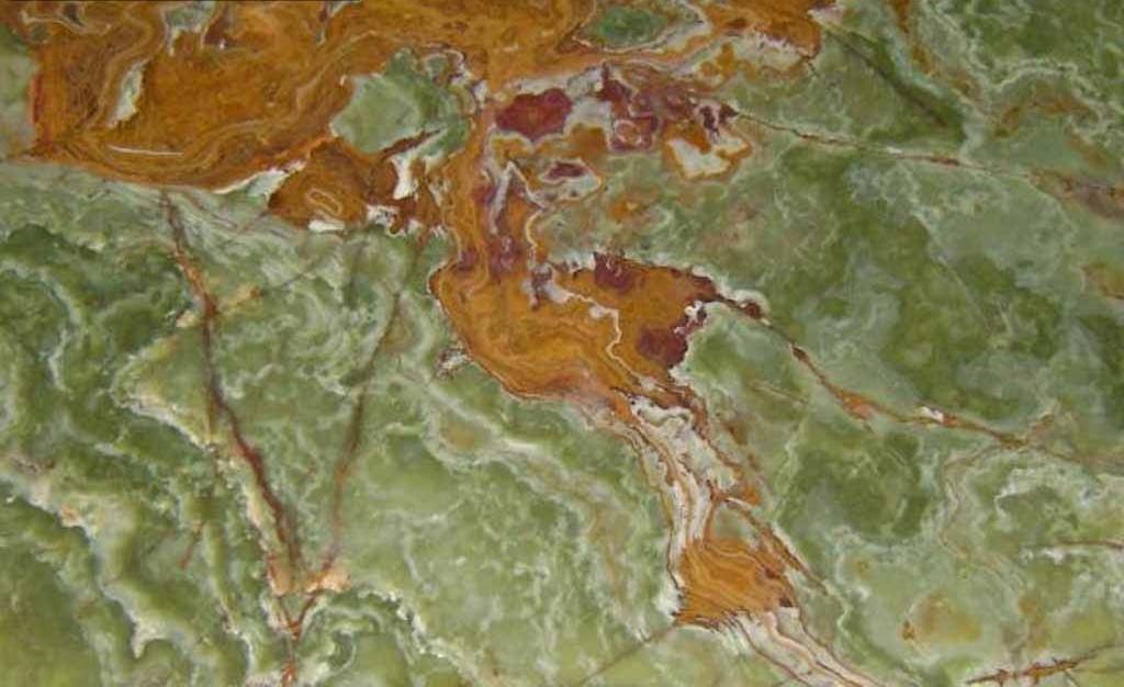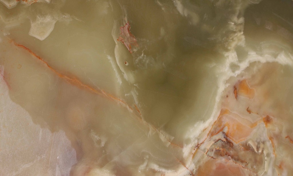 ONYX comes from Pakistan. It has a light green background invaded by large spots with more intense green tones, by red and orange veins and light elements, mainly white and beige, that create plays of light and movement. Green Pakistan Onyx is used as a decorative stone. When it is backlit the green of the material stands out even more for its gloss, making it a splendid piece of stone